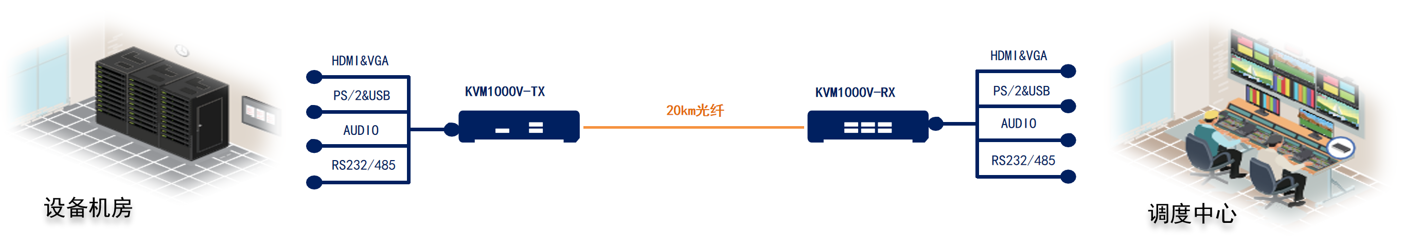 KVM1000V是一款面向工业自动化&轨道交通行业应用研发的一款KVM信号长线驱动器,核心采用高速FPGA芯片进行信号采集与编码,再通过使用单模&多模光纤作为载体将高清音视频与控制信号(包括:USB, PS/2键鼠,3.5mm立体声音频,VGA视频,HDMI视频,RS-232&RS-485等)依据不同通信距离的光模块,可以实现100米~80KM范围内的远程传输与控制。KVM1000V最小工作单元是由发射机(TX)与接收机(RX)组成,发射机采用模块化设计,能与被控目标计算机同时安装在19英寸标准机柜内,便于机房施工与维护。接收机采用紧凑式结构设计,便于安装在远端操作台或紧凑空间内。