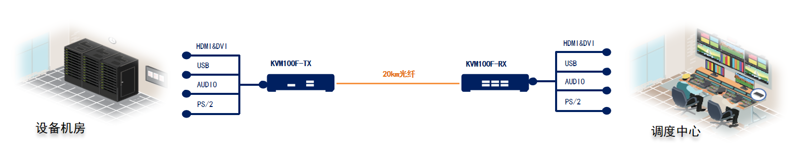 KVM100F是一款面向工业自动化&轨道交通行业应用研发的一款KVM信号长线驱动器,核心采用高速FPGA芯片进行信号采集与编码,再通过使用单模&多模光纤作为载体将高清音视频与控制信号(包括:USB, PS/2键鼠,3.5mm立体声音频,DVI视频,HDMI视频等)依据不同通信距离的光模块,可以实现100米~80KM范围内的远程传输与控制。KVM100F最小工作单元是由发射机(TX)与接收机(RX)组成,发射机与接收机采用紧凑式结构设计,便于安装在远端操作台或紧凑空间内。